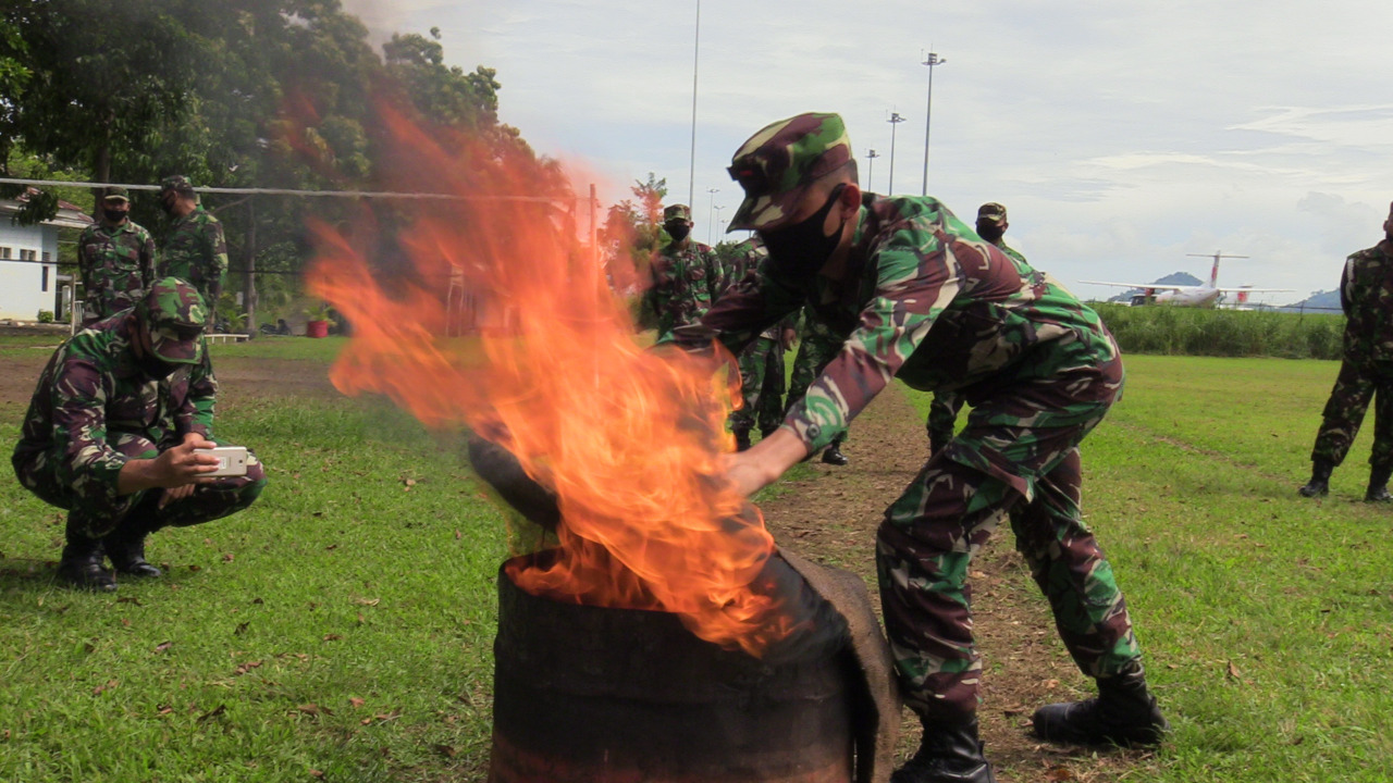 Personil Lanud Sam Ratulangi Manado berusaha memadamkan api dalam simulasi yang digelar, Rabu (9/9/2020). (foto: Serda Ridwan)