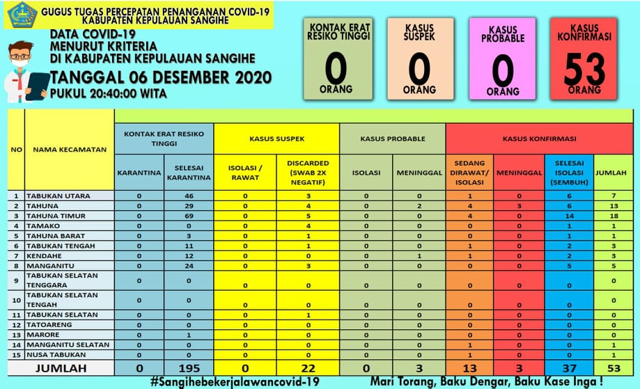 Berdasarkan data yang disampaikan Jubir Percepatan Penanganan Covid-19 Sangihe, dr Jopy Thungari, ketambahan 7 kasus baru positif Covid-19 di Sangihe, dengan akumulasi sudah mencapai 53 kasus.
