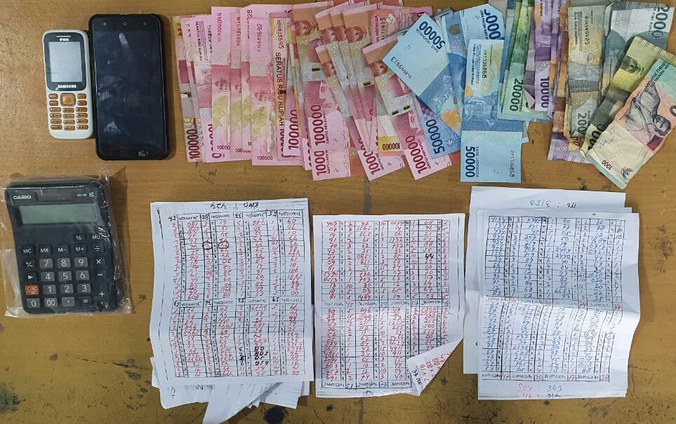 Bersamaan dengan itu, tim 2 melakukan penggerebekan terhadap terduga pelaku DM (31) bersama dengan barang bukti berupa1 buah hand phone merk realme warna biru hitam, 1 buah hand phone merk VIVO warna hitam, uang tunai sebesar Rp. 3.144.000, 3 lembar kertas hvs rekapan angka dan 1 lembar tabel shio 2020.