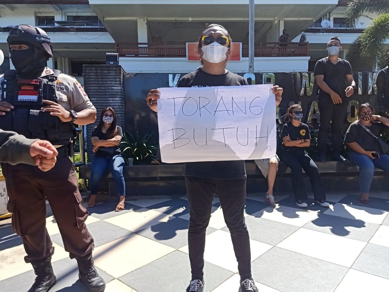Manado, Barta1.com – Sejumlah massa yang tergabung dalam Aliansi Pekerja Seni Sulut Bersatu menggelar aksi unjuk rasa di depan Kantor Wali Kota Manado, Kamis (25/2/2021). Mereka berunjuk rasa karena dipicu pembatasan waktu di tempat keramaian. Setelah satu jam menggelar aksi menggunakan alat musik full band, beberapa perwakilan dipanggil Pemkot Manado untuk melakukan mediasi.