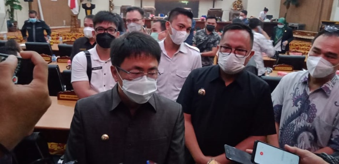 Walikota Andrei Angouw didampingi Wakil Wali Kota Richard Sualang melakukan konferensi pers usai mengikuti rapat paripurna bersama DPRD Manado (foto: randy/barta1)