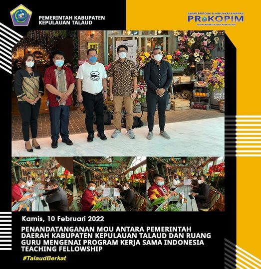 Talaud, Barta1.com – Bupati Kepulauan Talaud, Dr. dr. Elly Engelbert Lasut, ME menandatangani Memorandum of Understanding (MoU) antara Pemerintah Daerah Kabupaten Kepulauan Talaud dan Ruang Guru mengenai Program Kerjasama Indonesia Teaching Fellowship, (11/02/2022).