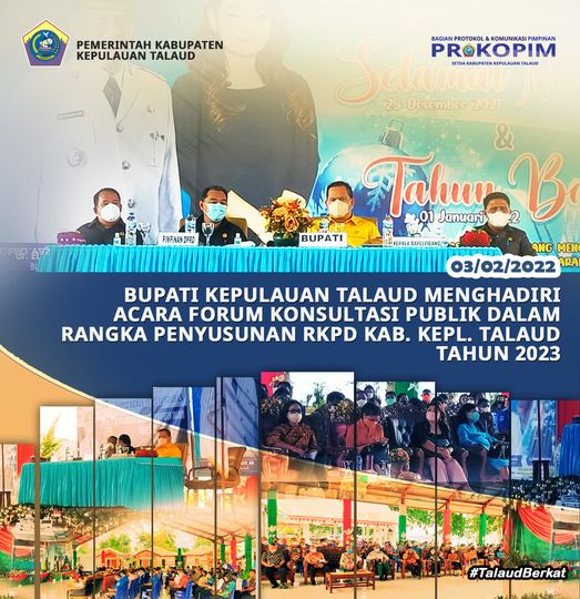 Talaud, Barta1.com – Bertempat di Wanala T2 Kabupaten Kepulauan Talaud, Bupati Kepulauan Talaud Bapak dr. Elly Engelbert Lasut, ME di dampingi oleh Pimpinan DPRD Kabupaten Kepulauan Talaud Bapak Djekmon Amisi, SH, MH, Voker R. Pelle, SE dan Kepala BAPELITBANG Bapak Dr. Imen Djoli Manapode, S.Pd, M.Pd Menghadiri Acara Forum Konsultasi Publik dalam rangka Penyusunan RKPD Kabupaten Kepulauan Talaud Tahun 2023Turut hadir :- Anggota DPRD Provinsi Sulaweai Utara Ibu Sherli Tjanggulung;- Pejabat Tinggi Pratama di Lingkungan Pemerintah Kabupaten Kepulauan Talaud, (15/02/2022).
