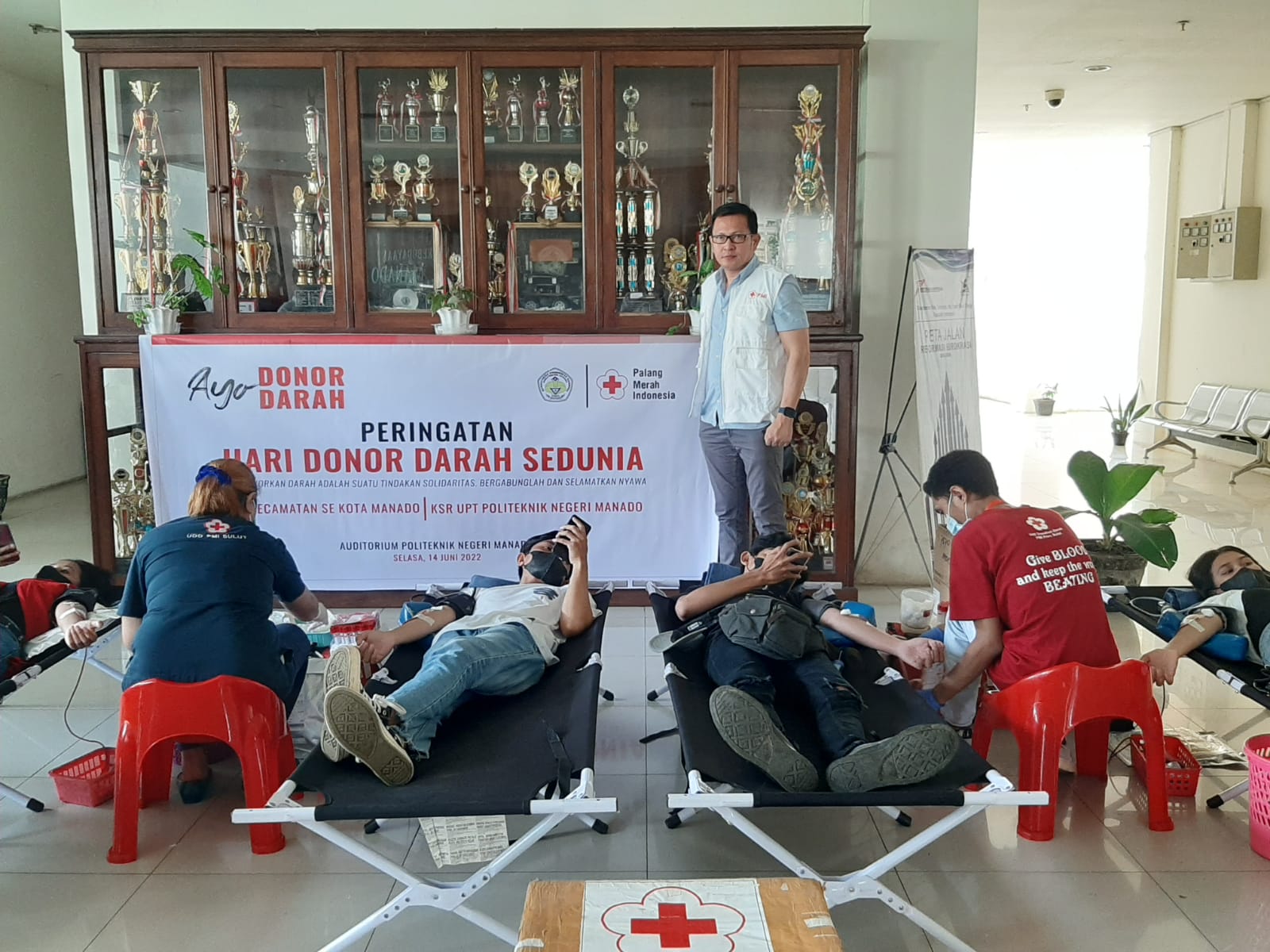 Manado, Barta1.com – Peringati Hari Donor Darah Sedunia, Unit Kegiatan Mahasiswa (UKM) Korps Sukarela (KSR) Palang Merah Indonesia (PMI) Politeknik Negeri Manado (Polimdo), bekerjasama dengan PMI se-kecamatan Kota Manado menggelar kegiatan donor darah, di Gedung Utama (GU) Polimdo, Selasa (14/06/2022).