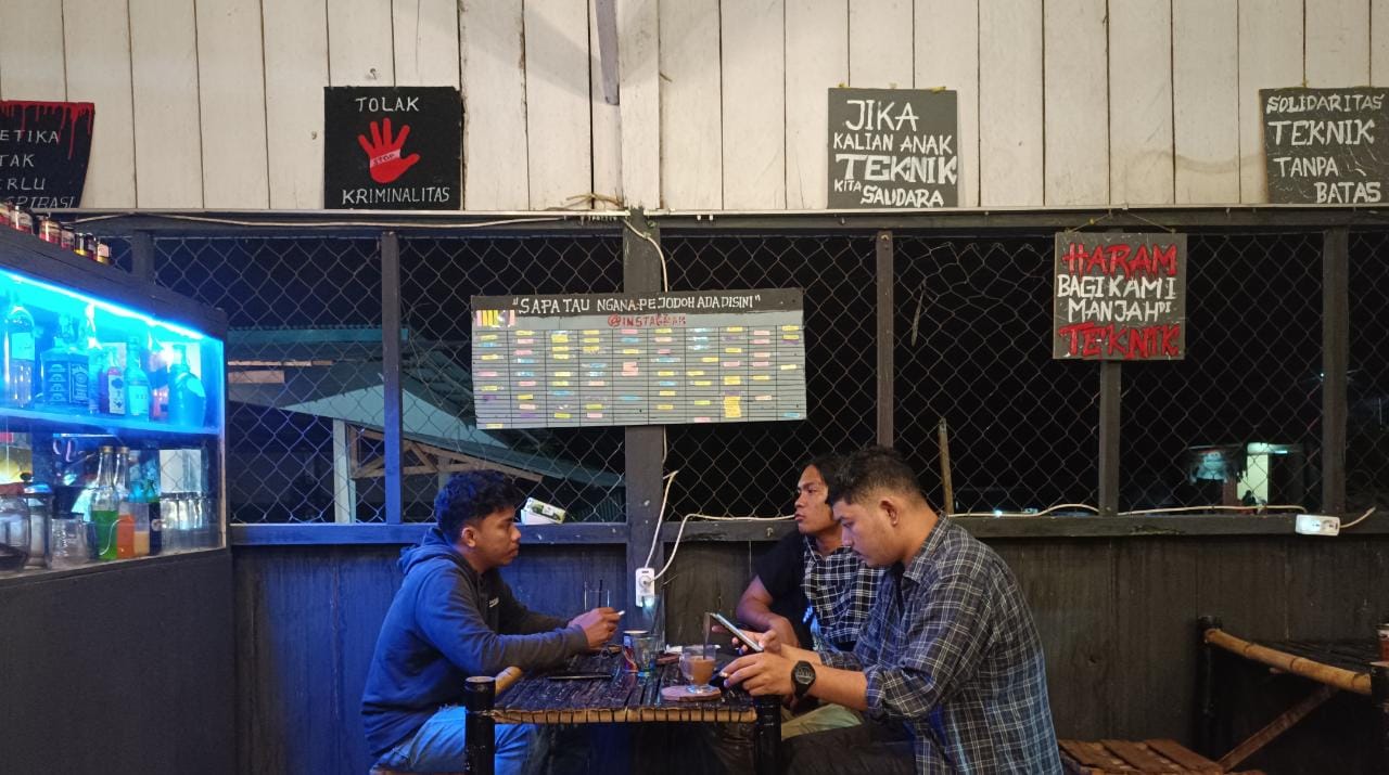 Tolak kriminalitas, solidaritas teknik tanpa batas, jika kalian teknik kita sudara, haram bagi kami manja di teknik, selesaikan revisi agar bisa resepsi, hitam aliranku tapi bukan sesat jalanku, tongkrongan kami. bukan, tongkrongan pecundang, nanti kita ceritakan tentang hari ini. Itu beberapa tulisan, yang terpampang di dinding cafe tongkrongan teknik.