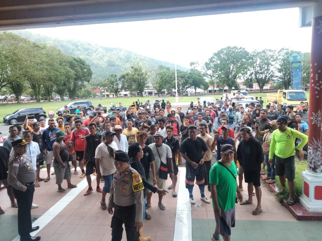 Usai demo di titik pertama tadi, pendemo kemudian menggelar orasi di Mapolres Kepulauan Sangihe, hingga akhirnya duduk bersama untuk mediasi di ruang rapat DPRD Kabupaten Kepulauan Sangihe.