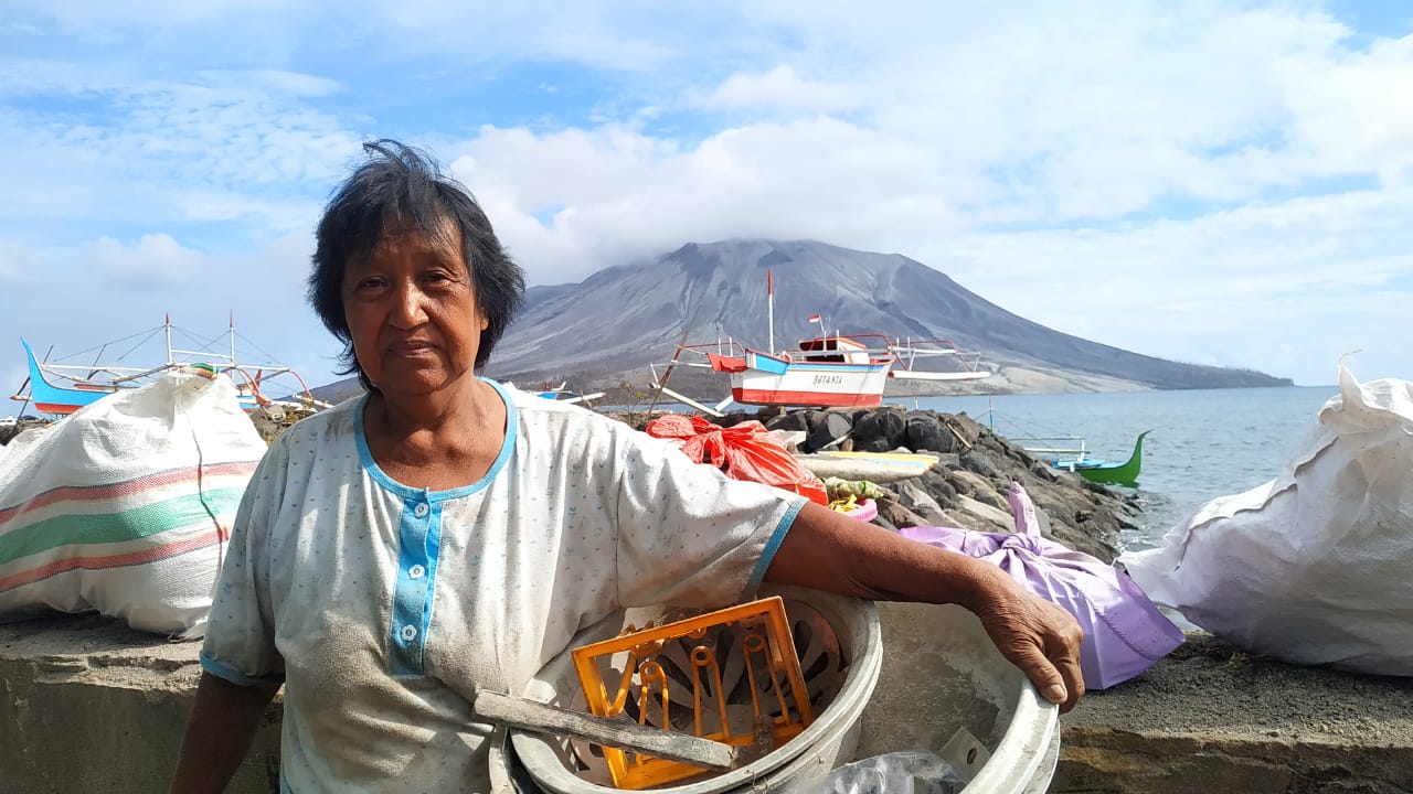 Di sela-sela membantu menurunkan barang dari perahu, saya mewawancarai Sius Hatibae, seorang pria berusia 61 tahun, meratapi nasibnya yang tertimbun material letusan gunung. “Rumah saya memang rusak, tertimbun material,” keluhnya dengan nada pilu. Dia mengingat letusan sebelumnya yang tidak sehebat yang mereka alami sekarang. “2002 sempat erupsi tetapi tidak seperti sekarang ini, ini paling parah,” tambahnya sambil sesekali ia menatap pulau ruang kampung halamannya.