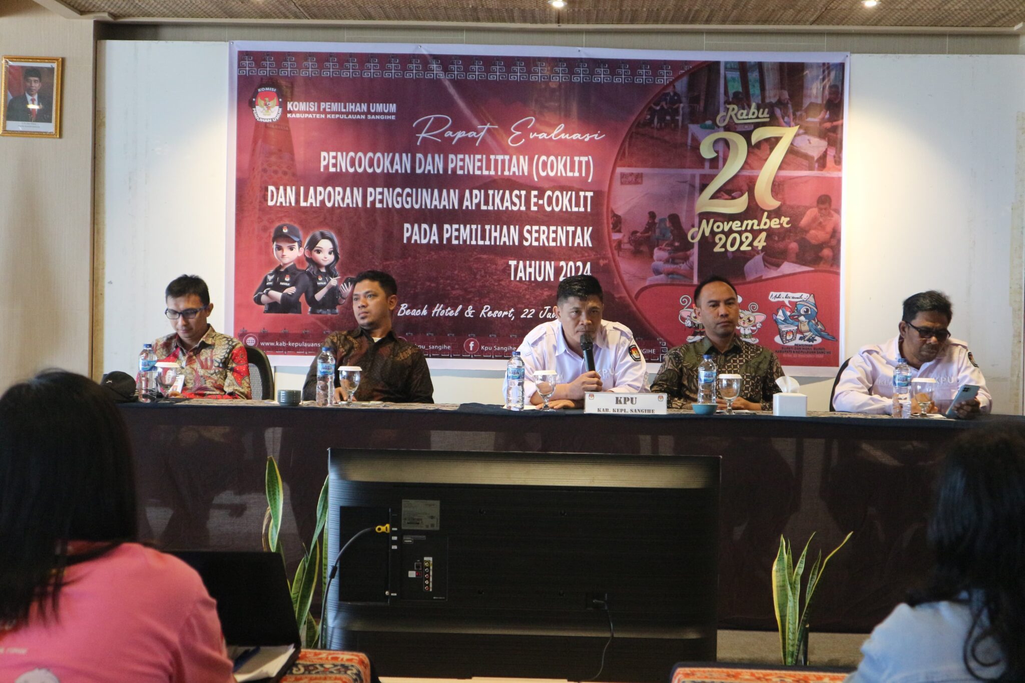 Sangihe, Barta1.com – Komisi Pemilihan Umum (KPU) Kabupaten Kepulauan Sangihe mengadakan Rapat Evaluasi Pencocokan dan Penelitian (Coklit) serta Laporan Penggunaan Aplikasi E-Coklit untuk Pemilihan Serentak Tahun 2024. Acara ini berlangsung di Tahuna Beach Hotel dan dihadiri oleh anggota Panitia Pemungutan Suara (PPS) yang membidangi data se-Kabupaten Kepulauan Sangihe.