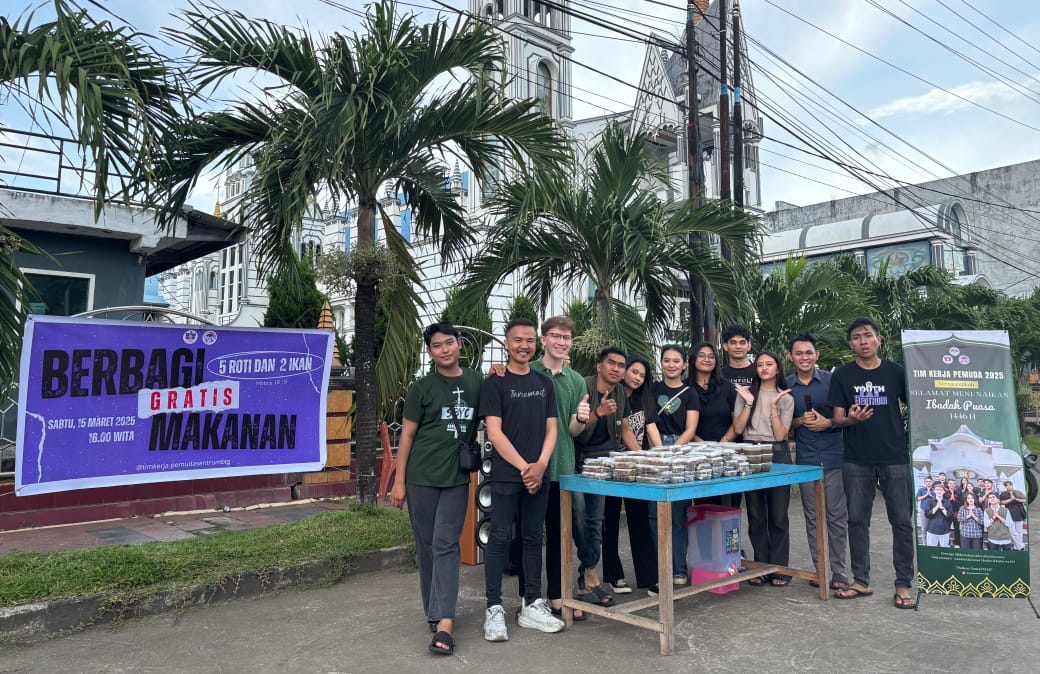 Cerita pada Matius 16:9 tentang pembagian 5 Roti dan 2 Ikan terlihat jelas pada baliho berwarna unggu, disertai dengan bener bertuliskan tim kerja Pemuda GMIM Sentrum Bitung Tahun 2025 mengucapkan selamat menunaikan Ibadah Puasa ke 1446 H.