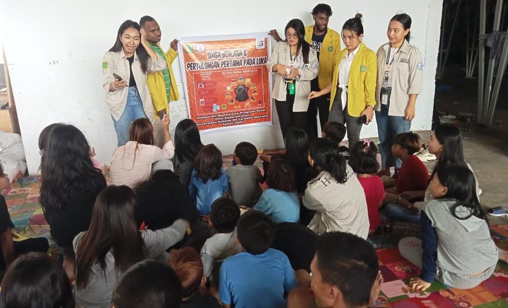 Manado, Barta1.com – Himpunan Mahasiswa Program Studi (Himapro) Ilmu Keperawatan Unika De La Salle Manado berikan edukasi kepada anak-anak Dinding Manado, berupa kesiapsiagaan bencana dan pertolongan pertama (PP) di Pasar Bersehati Manado, Sabtu (26/04/2025).
