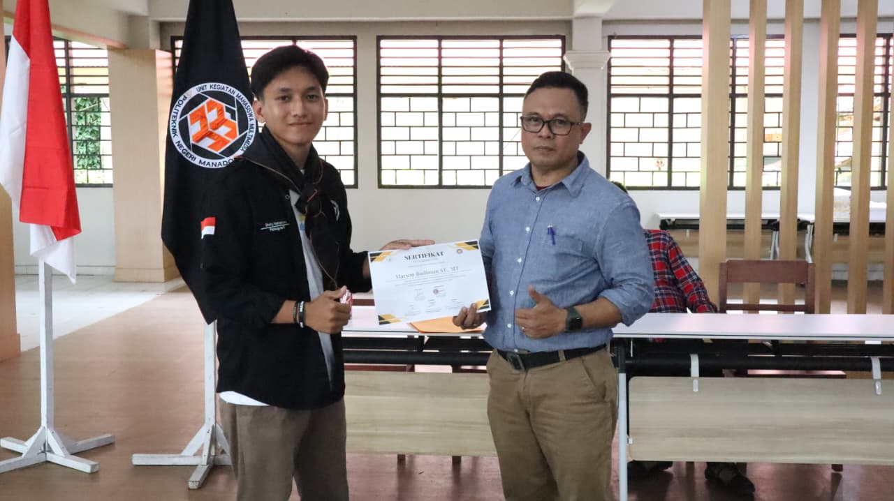 Ketua umum UKM Multimedia , Dicky Makapuas menyerahkan piagam kepada pemateri, yakni Kepala Jurusan Teknik Elektro Polimdo, Marson Budiman SST., MT. (foto: istimewa)