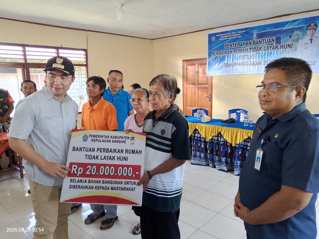 SANGIHE, BARTA1.COM – Pemerintah Kabupaten Kepulauan Sangihe terus menggenjot program pengentasan kemiskinan melalui pembangunan Rumah Tidak Layak Huni (RTLH). Pada Jumat, (29/8/2025), Bupati Kepulauan Sangihe Michael Thungari menyerahkan bantuan RTLH kepada empat keluarga penerima manfaat di Kampung Tariang, Kecamatan Kendahe.