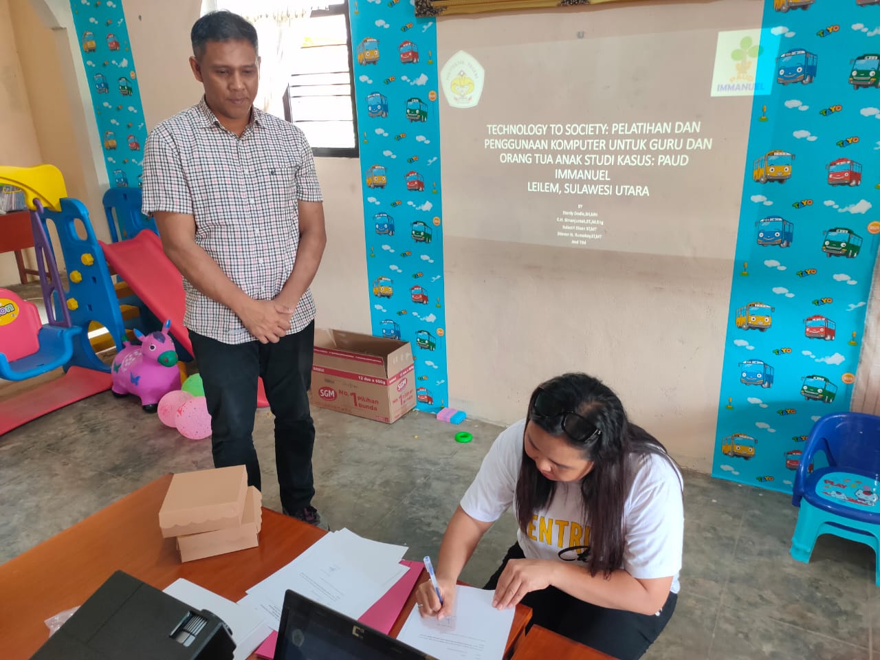 Selanjutnya Tim kedua yang dipimpin oleh Christopel H. Simanjuntak ST,M.Eng dengan anggota I Gede Para Atmaja,ST,MT, Adrian Warokka,ST.,M.Eng, Maureen Langie,ST.,M.Pd dan Leony A. Wenno ST,.M.Eng fokus untuk anak-anak didik PAUD, pelatihan dikemas dalam bentuk permainan edukatif berbasis komputer. Anak-anak diperkenalkan dengan keyboard, mouse, dan layar komputer melalui aktivitas menyusun gambar, mewarnai digital, dan pengenalan angka dan huruf menggunakan aplikasi khusus anak-anak.Respons Positif dari Orang Tua dan Guru