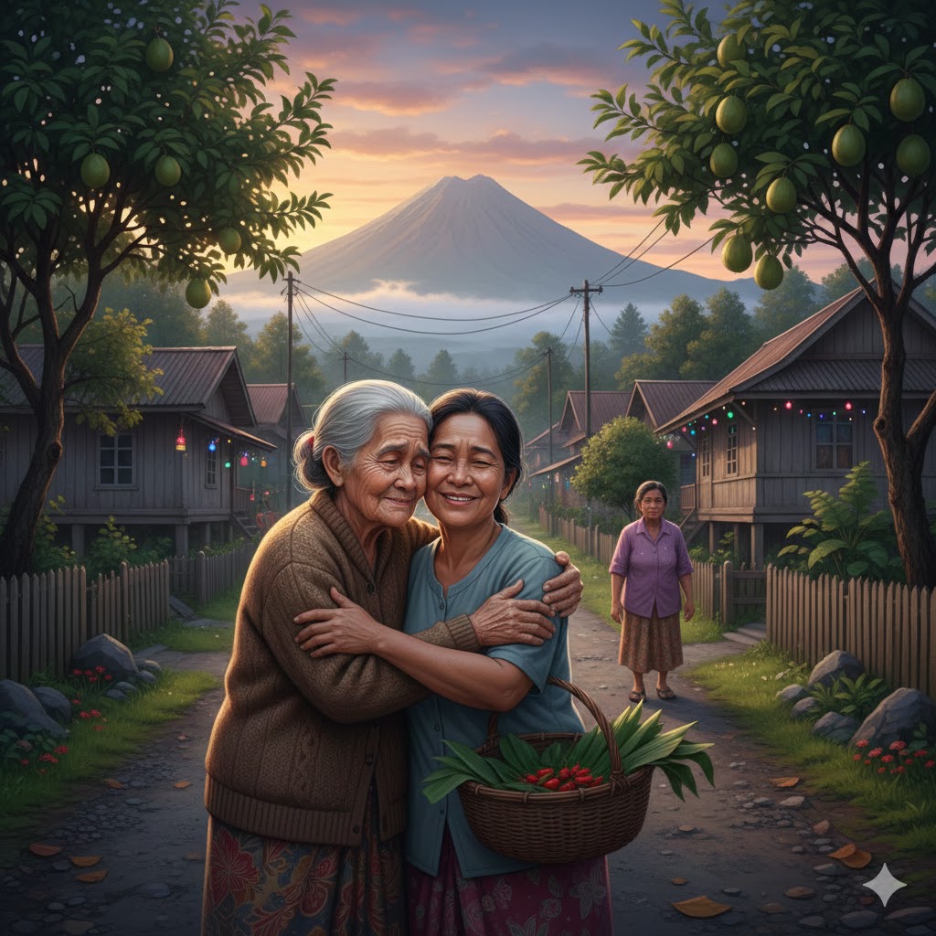 Angin Desember berdesir dingin, membawa aroma cengkeh yang baru dipanen dan sedikit wangi kue jahe dari rumah-rumah di Woloan. Di sebuah desa Minahasa yang damai, Tante Usi, perempuan 68 tahun itu duduk di bangku kayu di teras rumah panggung tuanya. Rambutnya yang memutih disanggul sederhana, dan matanya yang teduh menatap lekat jalan setapak di depan. Sudah bertahun-tahun ia hidup sendiri di rumah warisan ini, ditemani keheningan yang kian terasa pekat menjelang hari besar.