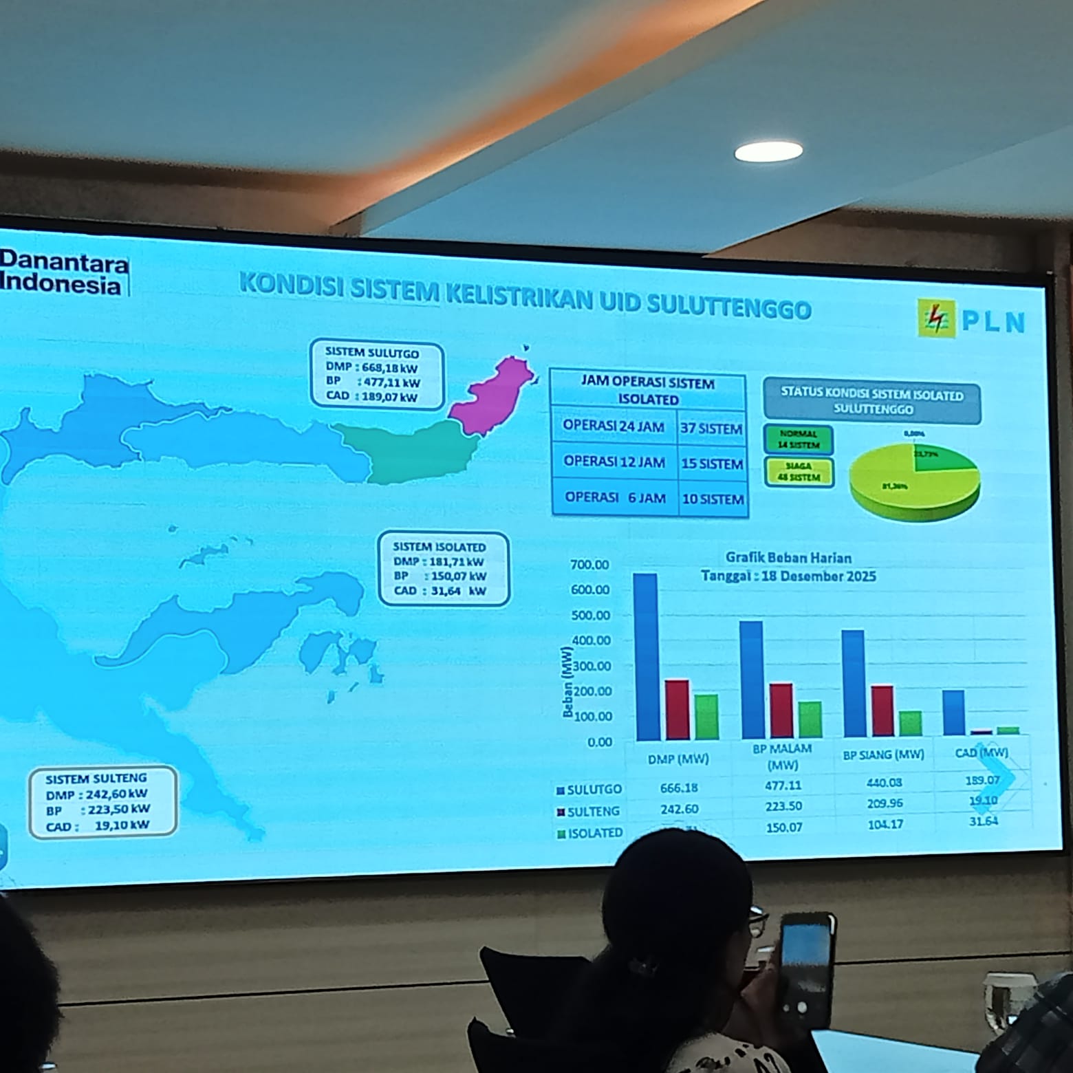 Rinciannya, sistem SulutGo memiliki daya mampu pasok 584,06 MW dengan beban puncak 508,36 MW dan cadangan daya 75,70 MW. Sementara itu, sistem Palu yang dipasok dari Grid Sulselbar memiliki daya mampu pasok sesuai kebutuhan sebesar 248,45 MW. Adapun sistem Isolated/Off Grid memiliki daya mampu pasok 181,71 MW dengan beban puncak 150,07 MW.