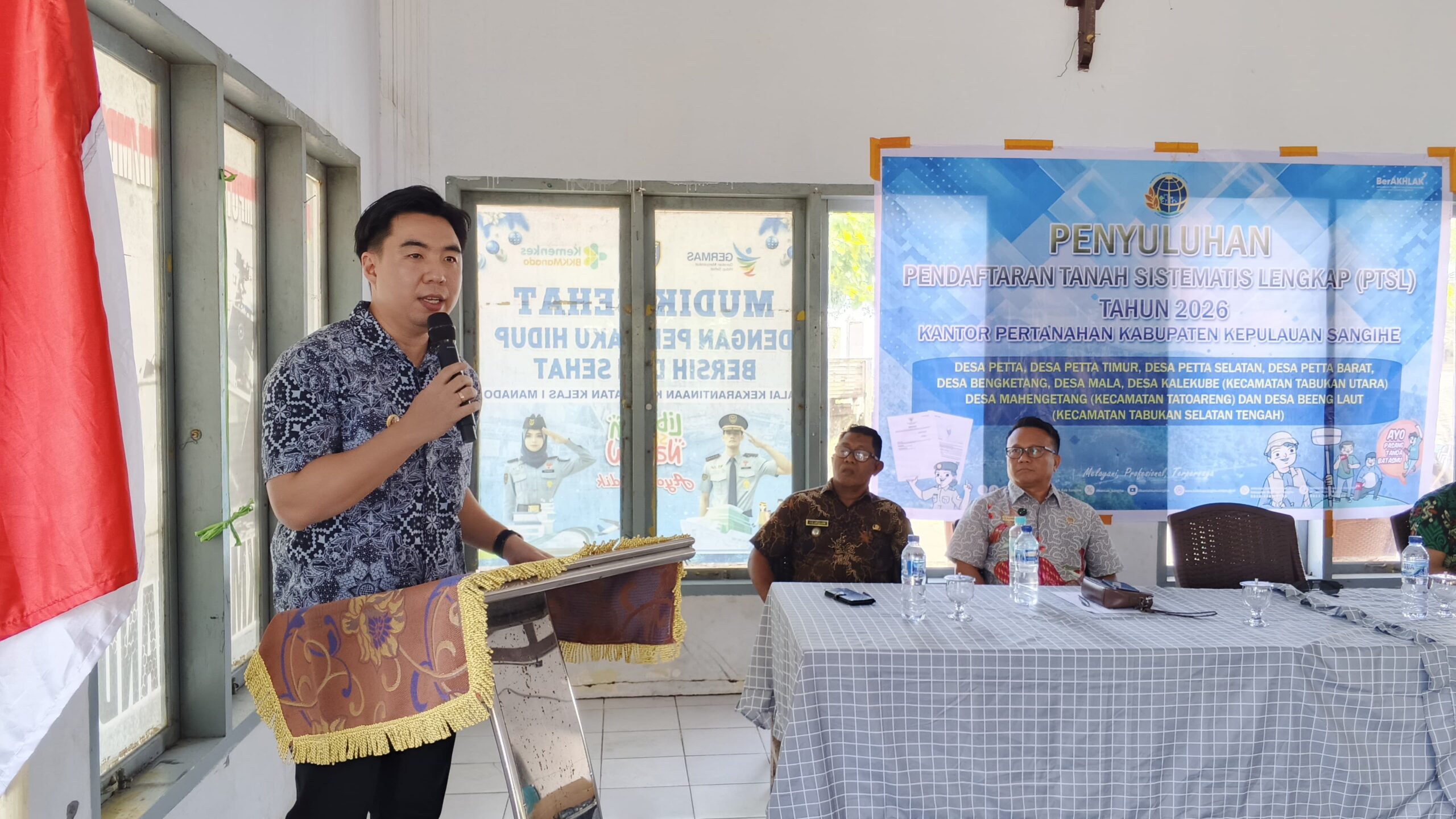 Sosialisasi tersebut dipimpin Bupati Kepulauan Sangihe Michael Thungari dan didampingi Kepala Kantor Pertanahan Sangihe Reynolds Alex Mukau. Program PTSL merupakan program strategis nasional yang bertujuan memetakan seluruh bidang tanah secara menyeluruh guna memberikan kepastian hukum atas kepemilikan lahan masyarakat serta mendorong tertib administrasi pertanahan.