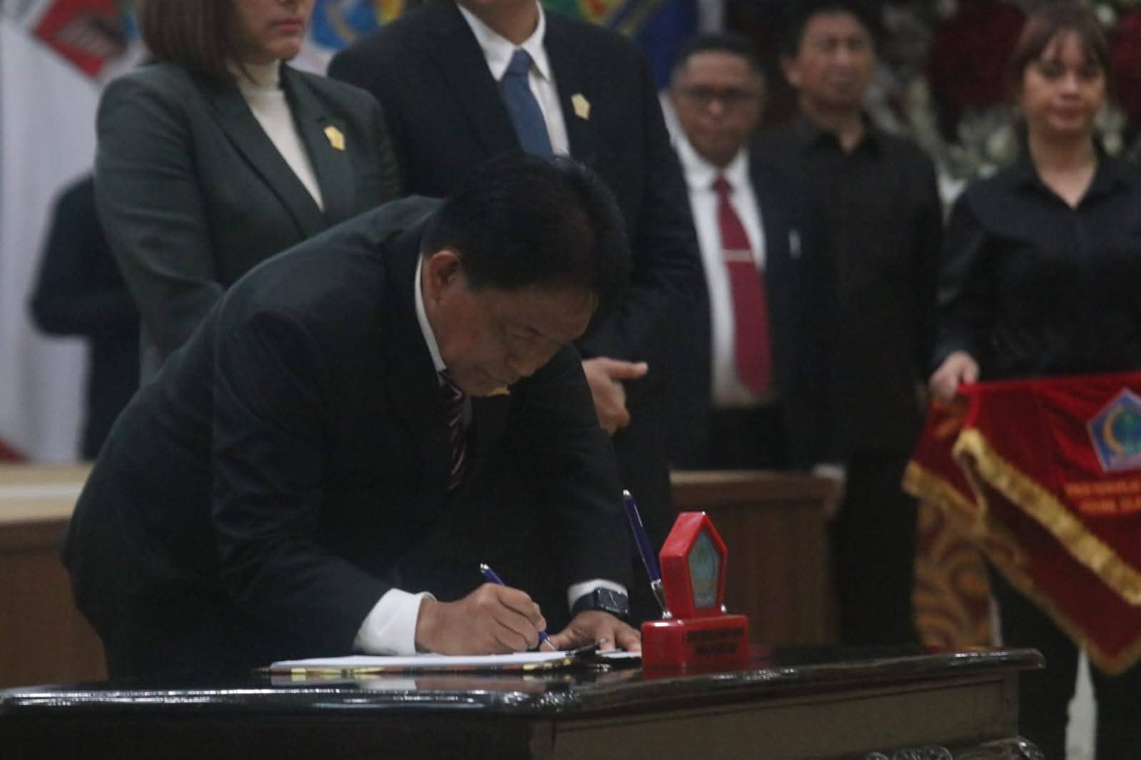 Saat paripurna, Gubernur Sulut, Yulius Selvanus, menyampaikan komitmennya bersama Wakil Gubernur Victory Mailangkay untuk terus mendorong kemajuan dan kesejahteraan masyarakat Sulut.
