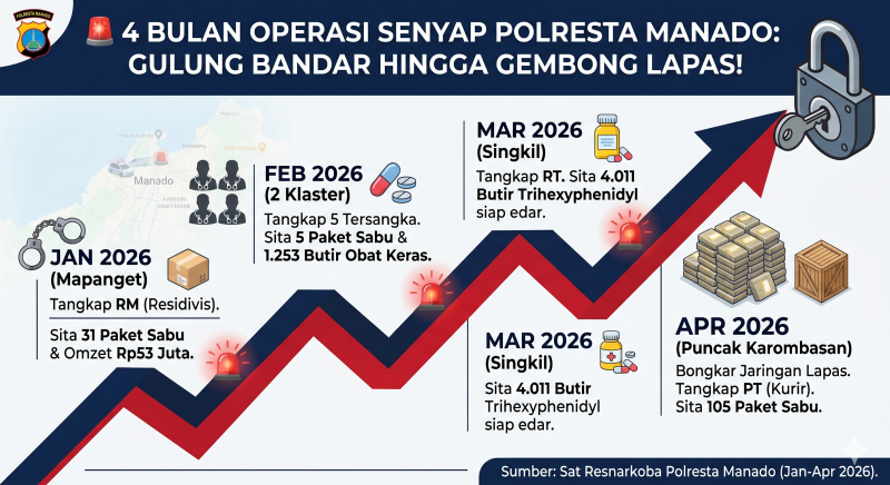 Jumlah ini mencakup 31 paket dari pengungkapan awal tahun di Mapanget, 5 paket pada periode Februari, hingga lonjakan drastis sebanyak 105 paket pada penggerebekan jaringan Karombasan di bulan April.